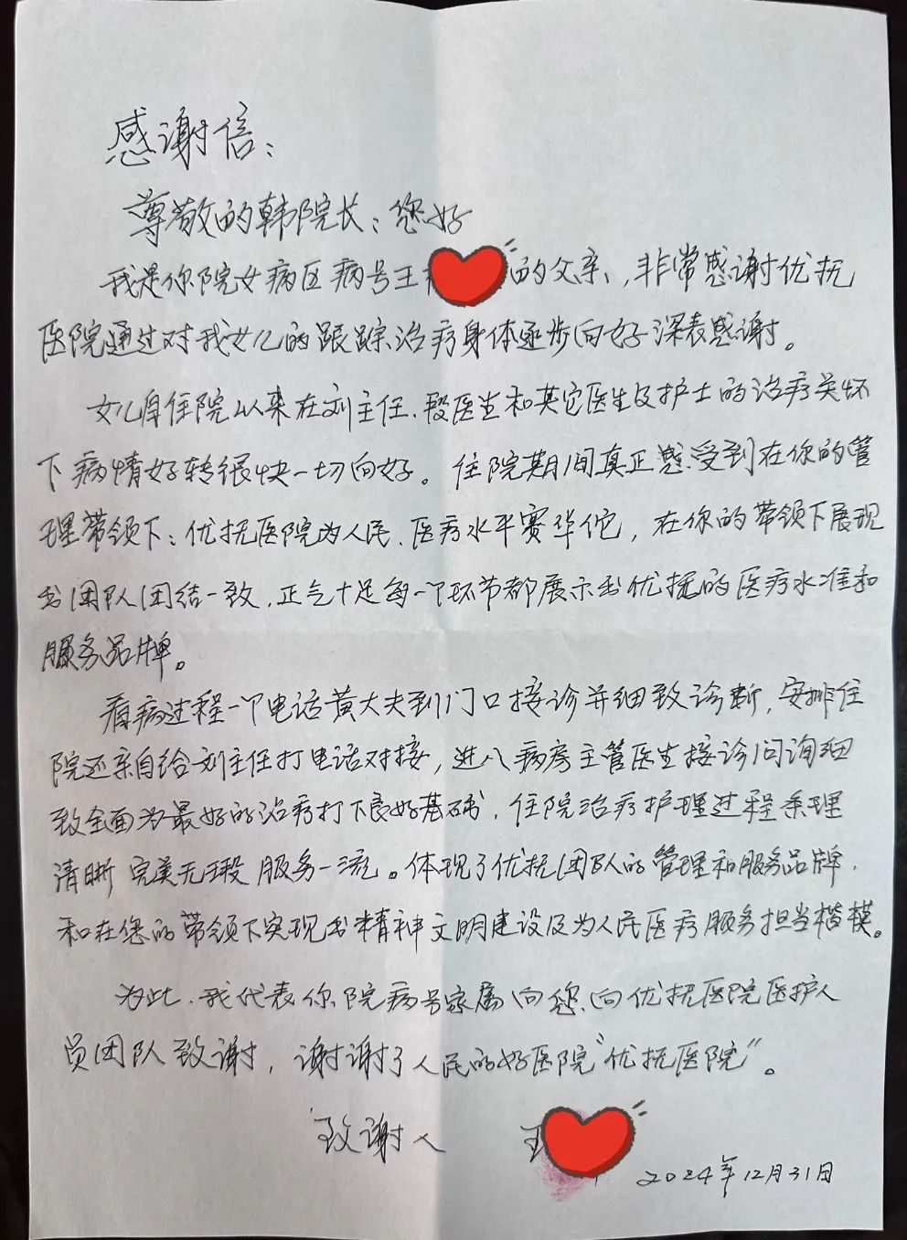 12月31日,濱州市優(yōu)撫醫(yī)院收到了一封由患者家屬親筆撰寫的感謝信,字里行間流露出的是衷心的感謝,這不僅是對優(yōu)撫醫(yī)院的肯定,更是對每一位醫(yī)護(hù)人員的激勵和鞭策。