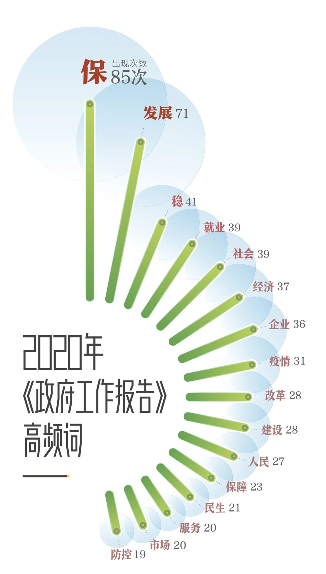 “穩就業、保民生”貫穿整份報告。在2020年《政府工作報告》中,“保”是出現頻次最高的詞,共出現85次。