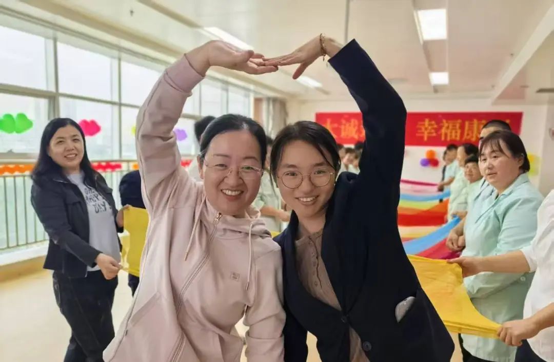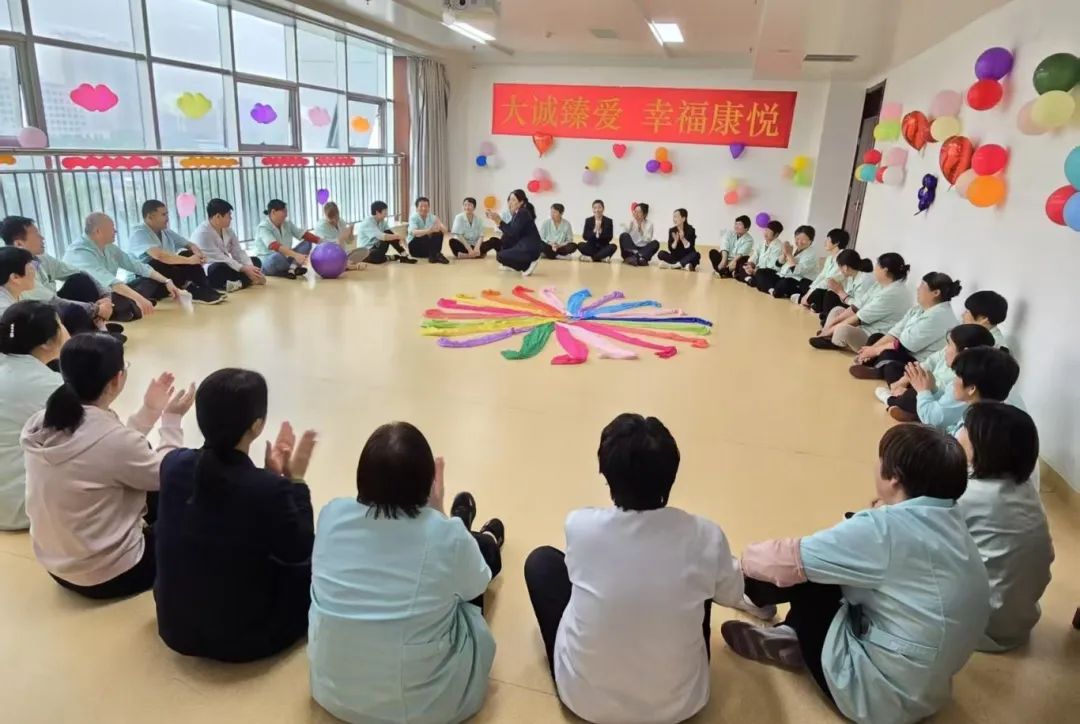與傳統舞蹈不同,本次活動不設固定舞步,亦無技巧評判。伴隨著悠揚的音樂,護理員們以“雀絲圈”的形式席地而坐,在舞動治療師亓霞、馬海平的引導下,通過呼吸調整慢慢回歸當下。舞動過程中,護理員們或張開雙臂如花開般舒展,或踮起腳尖隨節奏躍動,用最自然的肢體語言訴說心聲。為了讓參與者更好的釋放情緒,治療師還精心設計了“花兒朵朵開”“彩虹橋”等互動環節,通過科學的引導方式,幫助大家實現自我對話、情緒釋放和群體共鳴,在專業照護他人的同時,也給自己一份溫暖的關懷。