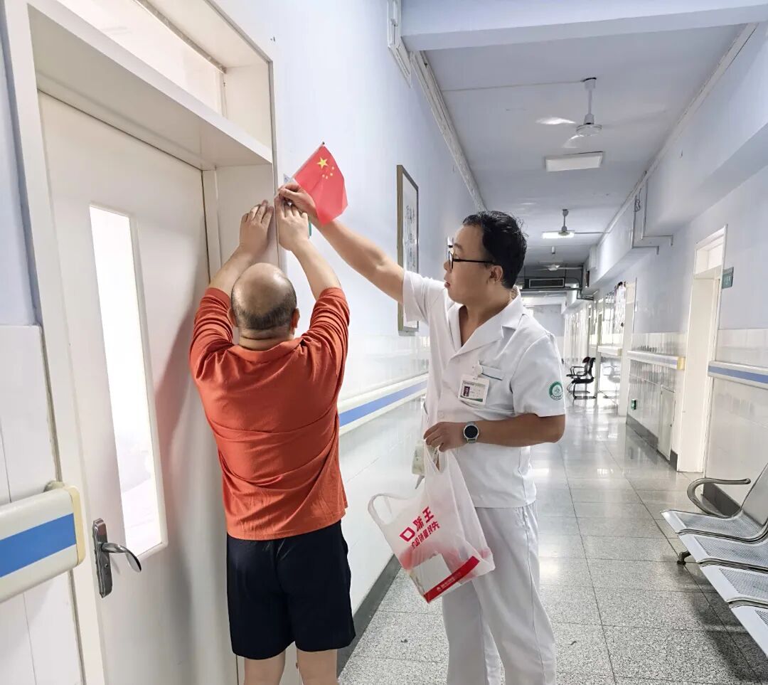 為緩解患者的思鄉之情,讓他們在節日里感受到家的溫暖,女病區醫護人員精心籌備了一場“醫患同心,歌唱祖國”小型歌會。活動室內,早已被一面面小紅旗和繽紛氣球裝點得喜慶溫馨。《我和我的祖國》等經典旋律被唱響,歌聲與笑容交織,溫暖在彼此心間流淌。