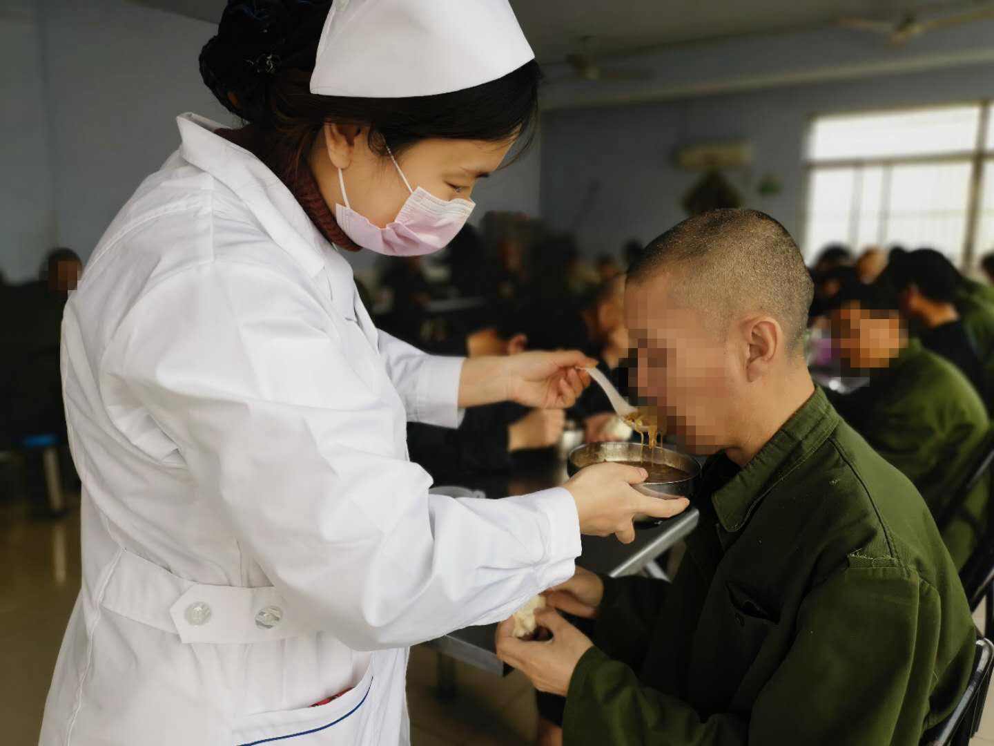 為讓輸液的患者準時吃上飯,護士高菲菲端進病房一勺勺地喂。